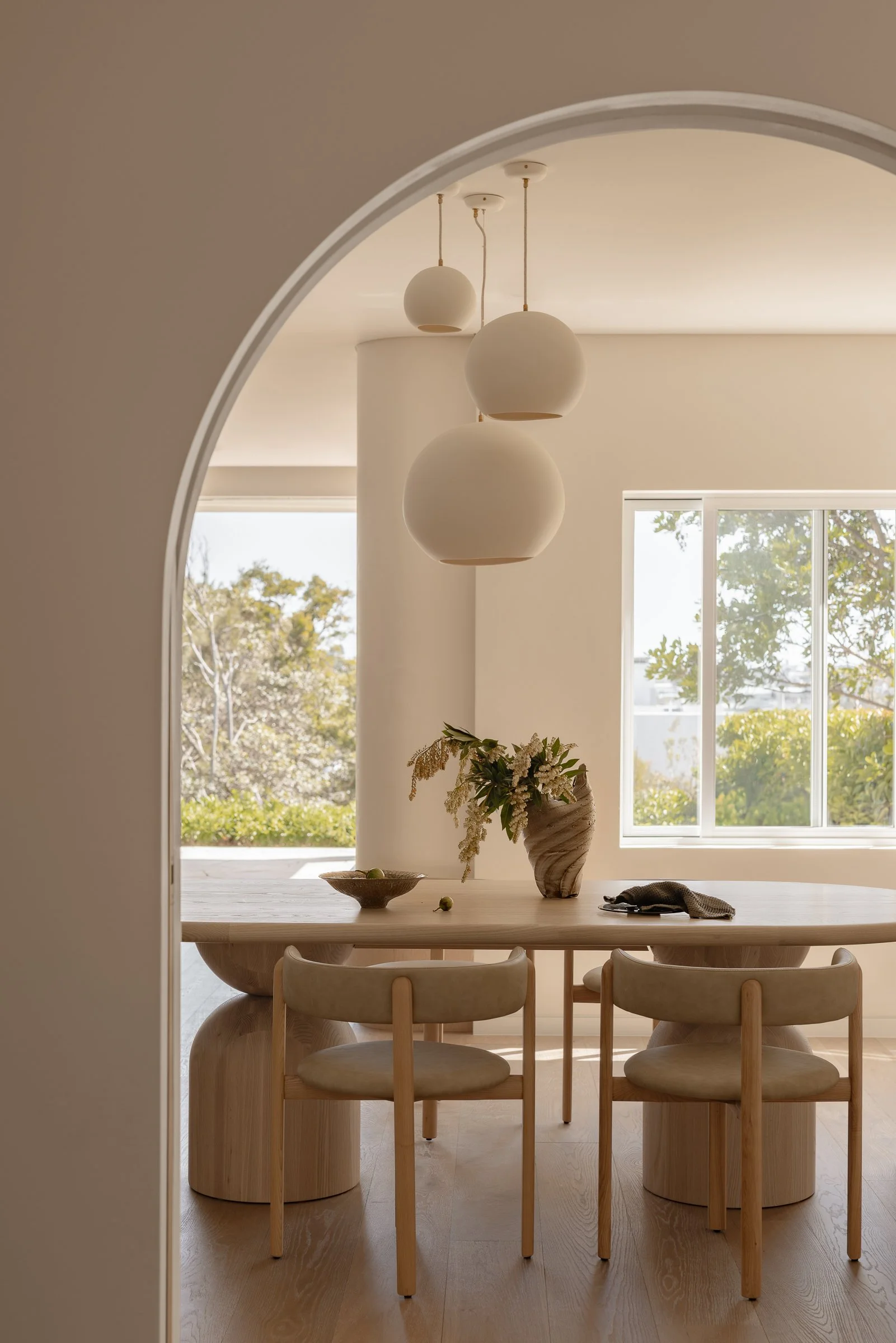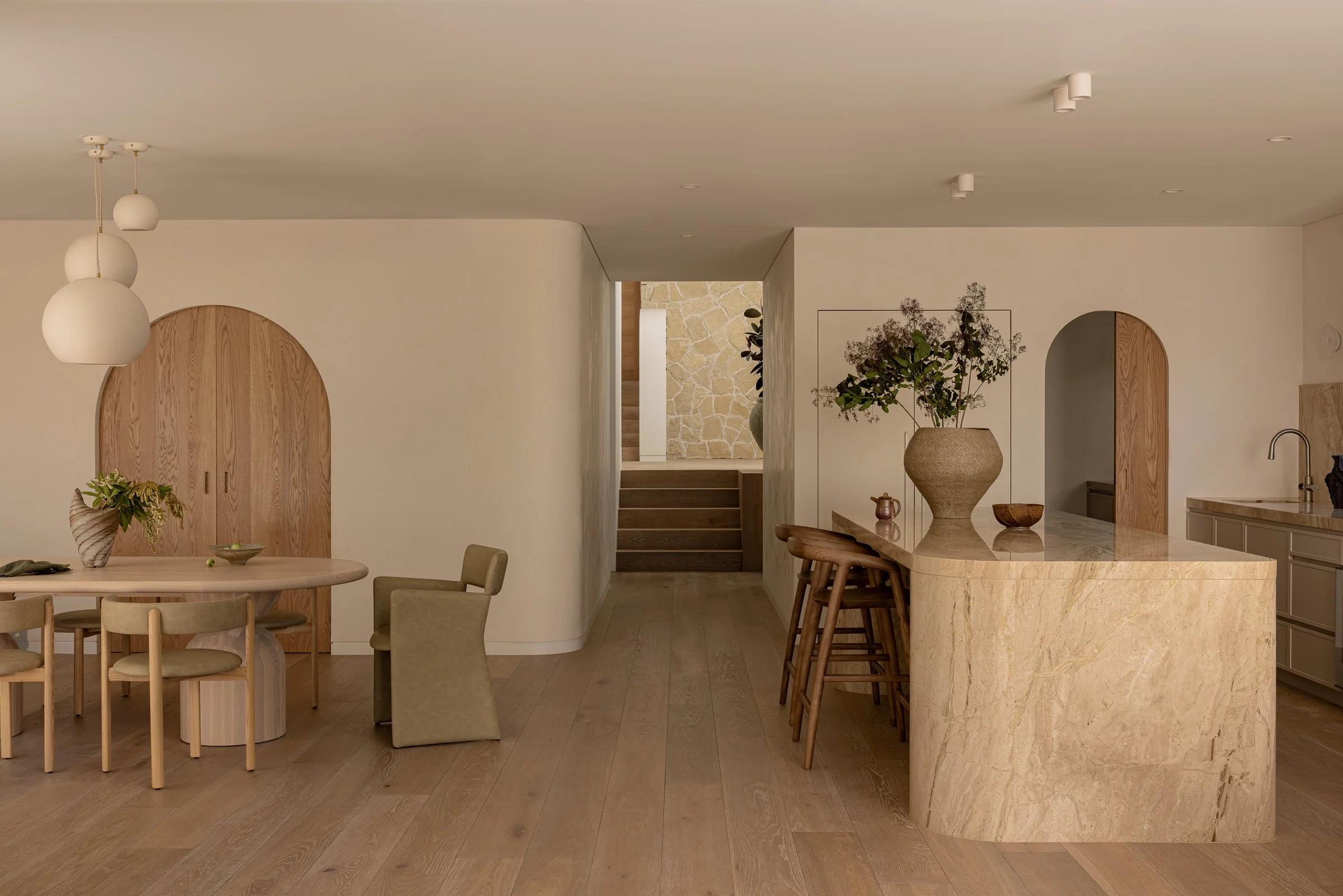 We continued to incorporate sweeping curves into the open-plan kitchen, living and dining room, pairing them with refined linear elements for aesthetic contrast. Arched cavity recessed sliding doors with carved timber inset pulls create a motif throughout, delineating space.