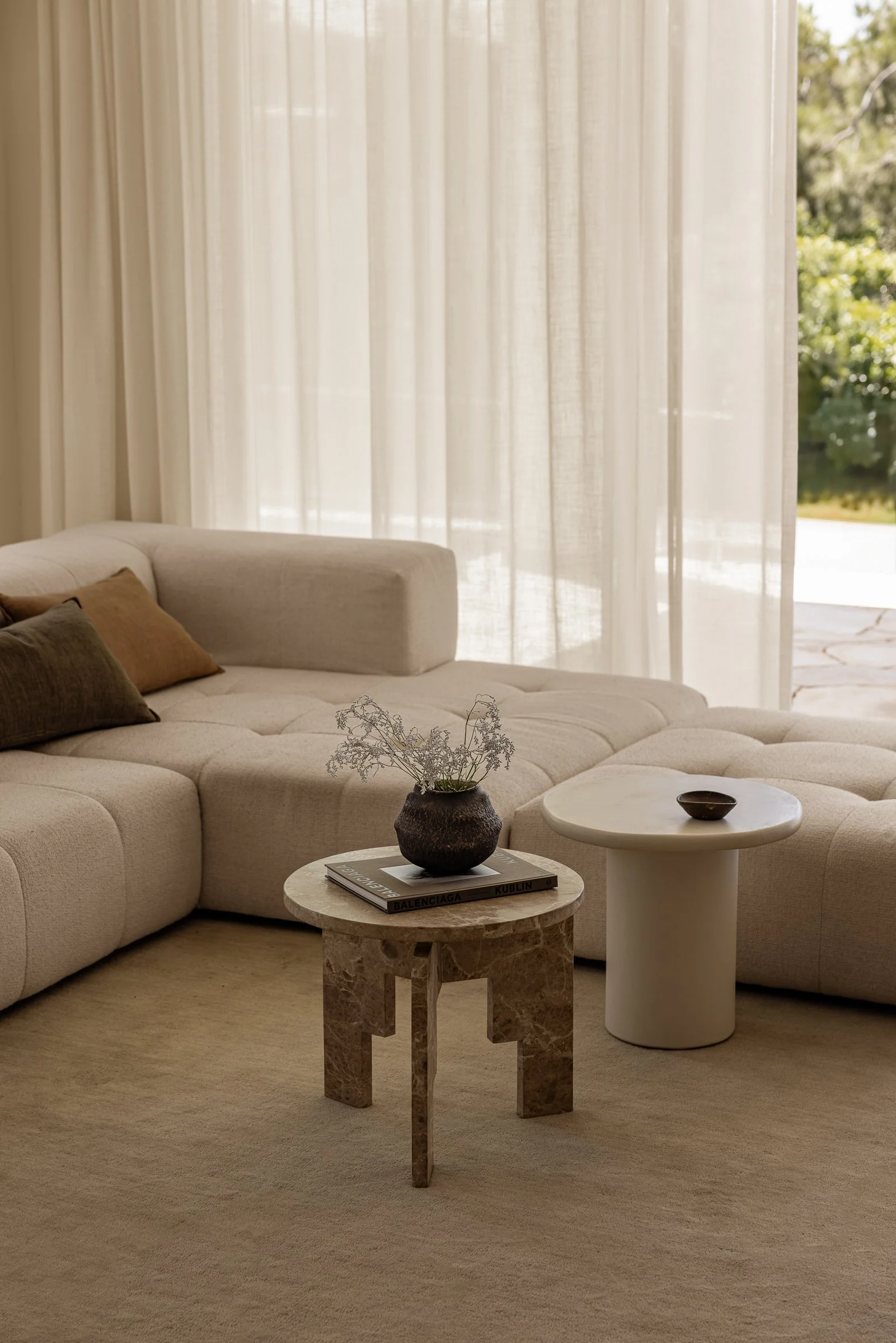 The office maintains the sense of calm that flows throughout the home, with nude-toned timber joinery complemented by an Aida marble top and shelves. A natural wool rug brings comfort, along with the curved, handmade desk and rustic chairs.