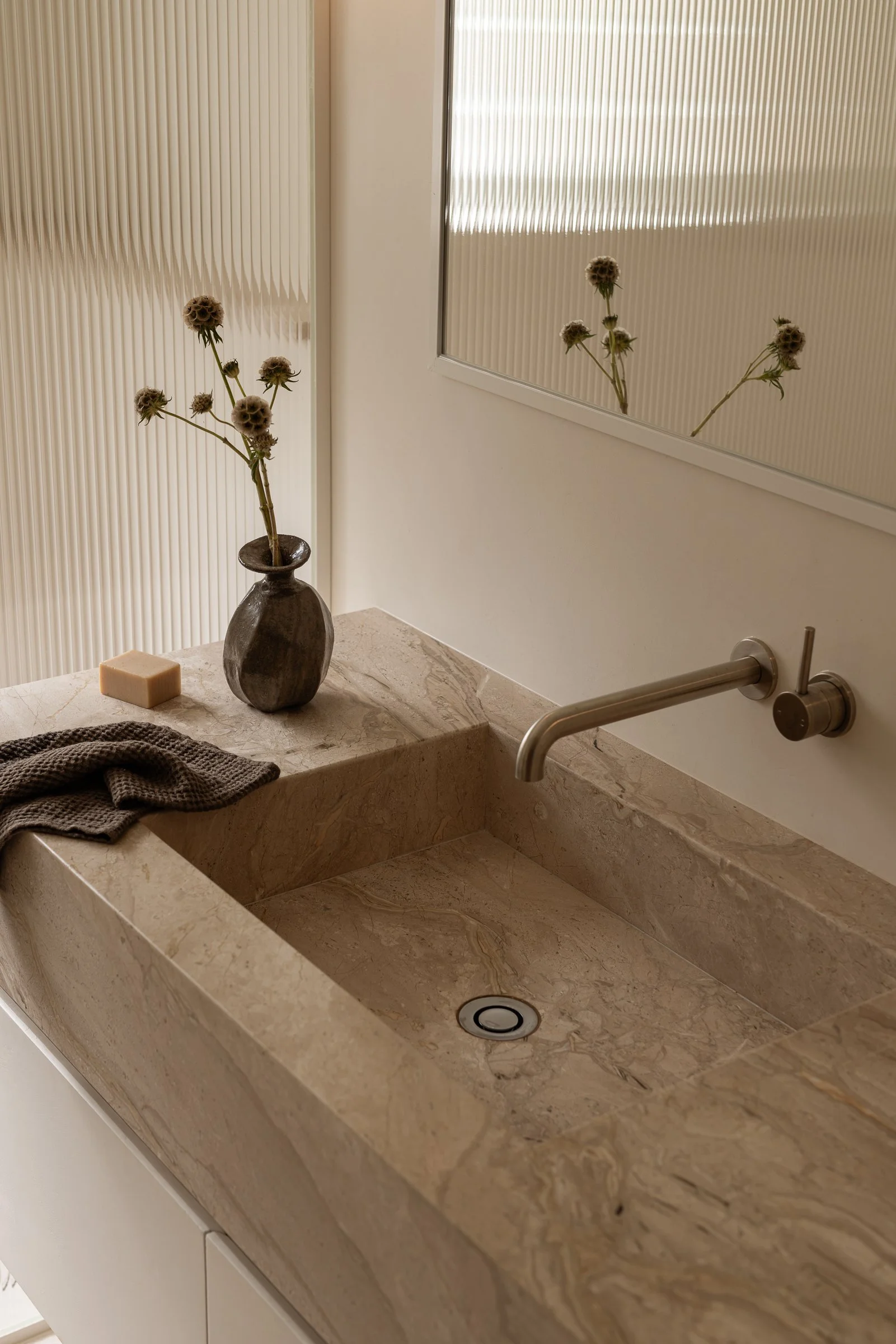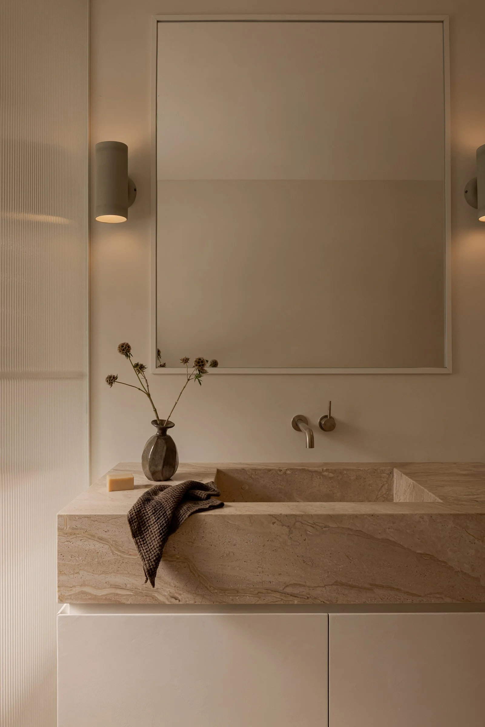 To provide an entirely rejuvenating haven, the bathroom maintains a refined simplicity. Tumbled limestone flooring is soft underfoot, with fluted glass bringing linear detailing, shifting light. Aida marble meets warm-white microcement cabinets, and hints of colour emerge in the subtle sage green wall lights, and brushed nickel fixtures.